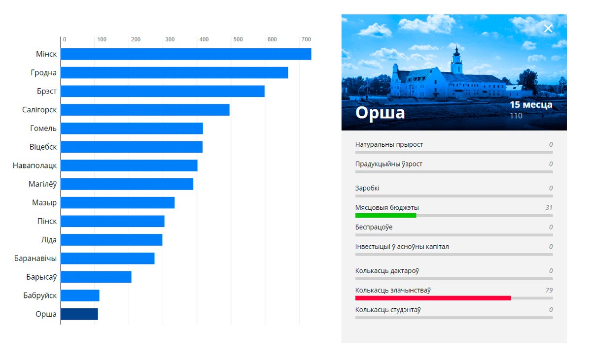 Экономические показатели, кроме Минска, выше всего у Новополоцка, Солигорска, Мозыря. В демографические и экономические аутсайдеры согласно рейтингу попали Орша, Борисов и Бобруйск.