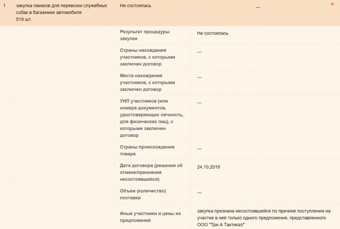 После звонка Еврорадио в статусе тендера отметили, что он не состоялся, так как поступило только одно предложение — от ООО "Три А Тактикал". Сейчас Департамент охраны МВД сможет провести закупку из одного источника, отчёт о которой не публикуется. И мы так никогда и не узнаем о том, сколько белорусским силовикам стоили гамаки для собак.