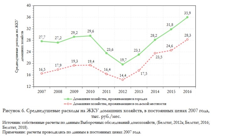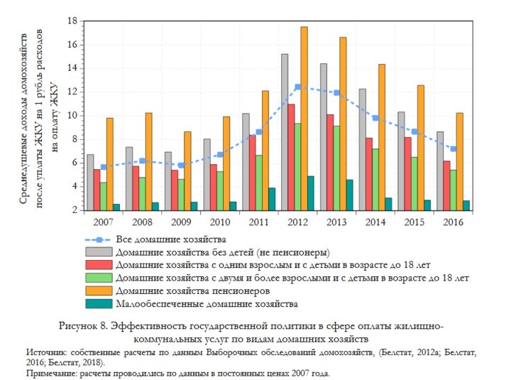 Например, в 2016 году у малообеспеченных семей на 1 рубль расходов на оплату ЖКУ оставалось в среднем 2,8 рубля среднедушевых доходов (среднедушевых доходов домохозяйства после оплаты ЖКУ). Это в 2,6 раза меньше, чем в среднем по всем домохозяйствам Беларуси.