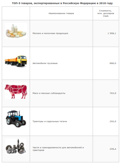 Основу белорусского экспорта товаров в Российскую Федерацию составляют молочная и мясная продукция, грузовые автомобили, тракторы и седельные тягачи, части и принадлежности для автомобилей и тракторов, мебель, тара пластмассовая, лекарственные средства, расфасованные для розничной продажи, готовая или консервированная рыба, икра, провода изолированные, кабели.