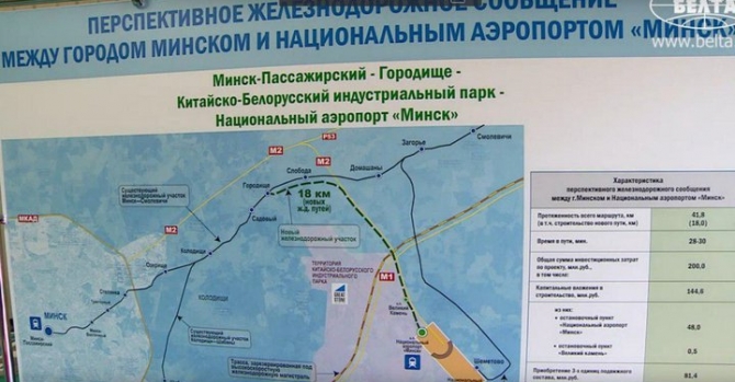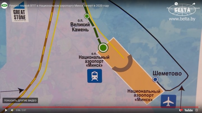 На видео, опубликованном на сайте информационного агентства БЕЛТА, хорошо видна схема железной дороги в аэропорт. Из нее следует, что поезд пойдет по существующей ветке от станции «Минск-Пассажирский» до Городища. От Городища собираются построить 18 километров новых железнодорожных путей — вдоль трассы М2. Дальше запланирован остановочный пункт «Великий Камень», а потом — остановочный пункт у аэровокзала Национального аэропорта Минск.