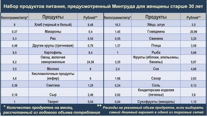 Оказывается, что купить рекомендуемые Минтруда виды и объем продуктов можно, потратив 119,5 рублей. Значит, если очень постараться, то можно сэкономить на еде около половины выделенной суммы. Правда, это уже будет не удовлетворение потребностей, а, скорей, выживание.
