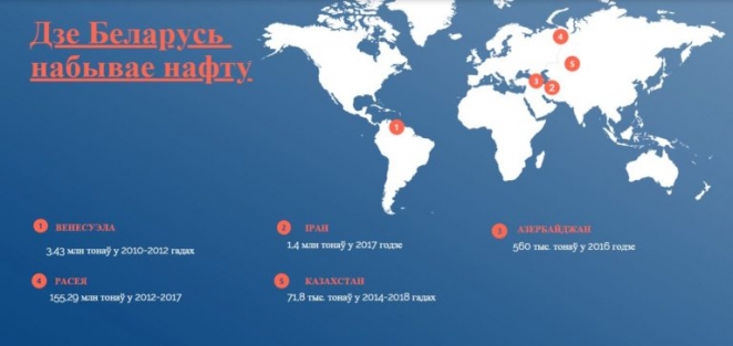 Активно Беларусь искала альтернативу российской нефти во время кризиса в отношениях с Россией в 2010 году. Тогда Минск был вынужден поставлять сырье через нефтепровод Одесса – Броды из Венесуэлы. Всего было поставлено около 3,4 млн тонн. В 2016-2017 годах Беларусь покупала также нефть в Азербайджане (560 тыс. Тонн) и Иране (1,4 млн тонн).
