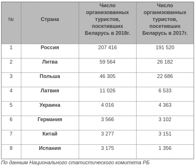В топ-8 стран с наибольшим числом туристов, посетивших Беларусь, неожиданно вошла Испания. Испанцы потеснили, в частности, эстонцев. Наилучшая динамика у ОАЭ. Число туристов из Эмиратов выросло с 28 до 1 034 человек. Также заметно увеличилась популярность белорусского направления у жителей Бельгии (с 249 до 1123 туристов) и Нидерландов (с 617 до 1003 туристов).