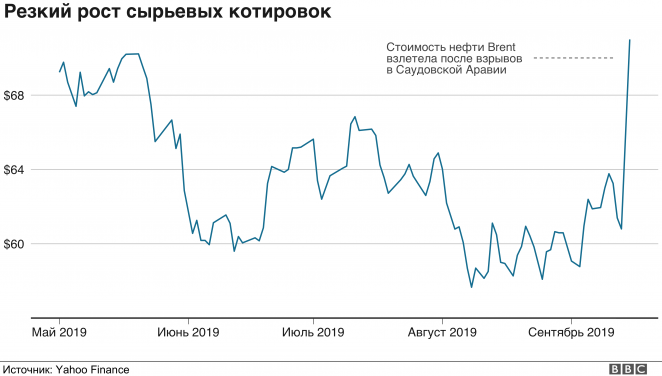 Основная причина - нападение дронов на нефтяные объекты в Саудовской Аравии. В результате атаки Саудовская Аравия сократила добычу нефти на 5,7 млн баррелей в сутки - это около 5% мирового предложения нефти. Источники агентства Рейтер сообщали, что вопрос о полном восстановлении добычи может занять недели, но часть добычи будет восстановлена в ближайшие дни.