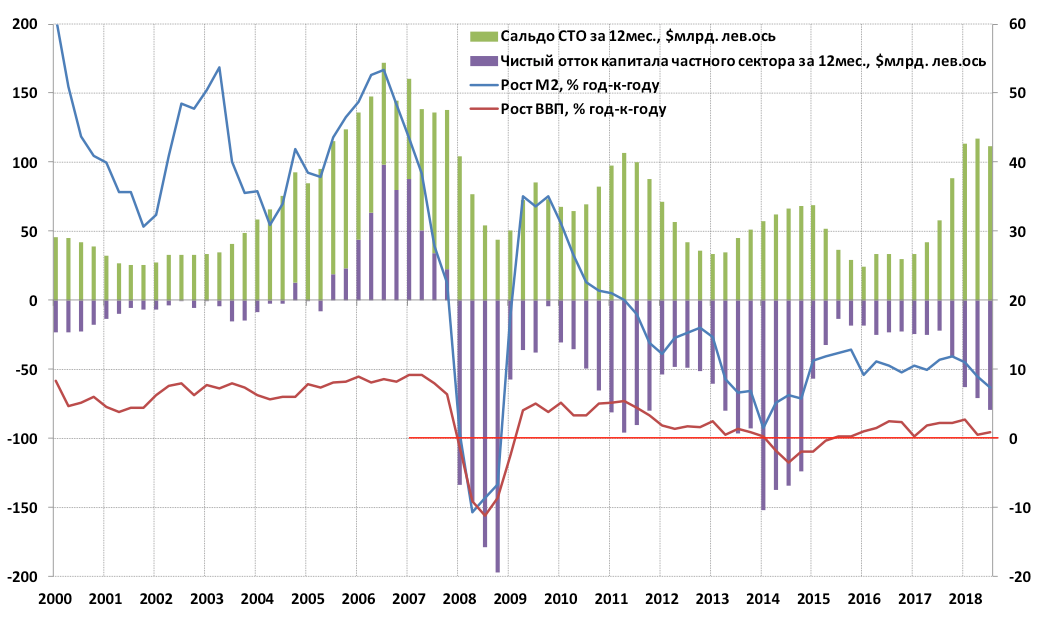 И конечно, кредитно-денежная политика вновь должна быть стимулирующей, как в начале 2000-х, когда денежная масса росла быстрее ВВП, а приток валюты по счету текущих операций не вывозился обратно за границу и тратился на инвестиции внутри страны (см. рис. 2). Тогда и только тогда мы сможем показать рост реального ВВП на 5-8%, а не осцилляцию вокруг нуля, как это происходило последние 10-12 лет.