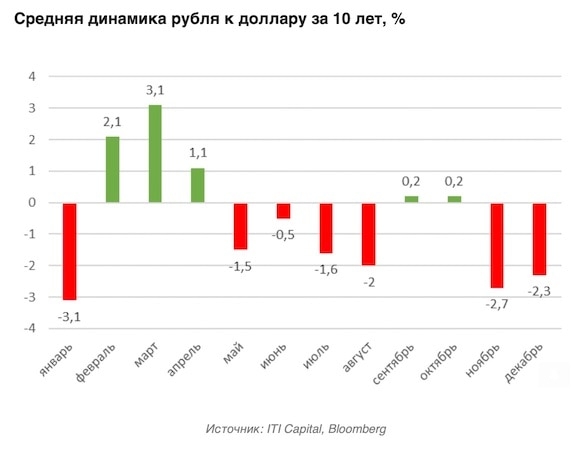 Корпоративные клиенты частично избавляются от рублей, вероятно, страхуясь от рисков, которые российской валюте приносят зимние месяцы. Согласно статистике за последние 20 лет, рубль в среднем терял 2,7% в ноябре, 2,3% в декабре, а худшим месяцем для рынка является январь, когда курс проседает на 3,1%, подсчитали аналитик ITI Capital.