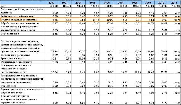 За 16 лет вес сырьевых отраслей в ВВП вырос в 2 раза: в 2002 год он составлял всего 6,66% (.xls). Доля обрабатывающего сектора - фабрик и заводов, не связанных с углеводородной трубой, - опустилась с 17,17% до 14,3%.