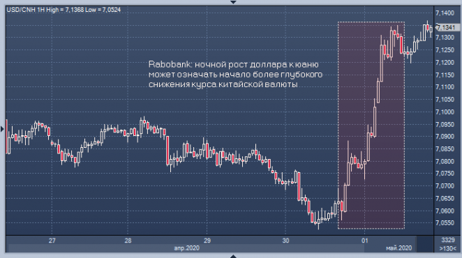 Сегодня Китай, как и большинство других стран Азии, отмечает праздник, поэтому непохоже, чтобы ночной взлет курса доллара к юаню был обусловлен действиям официального Пекина, обеспокоенного ухудшением отношений с США. Теперь, когда приуроченная к окончанию месяца ребалансировка портфелей осталась позади, курс доллара может начать новую волну роста против валют развивающихся стран, включая и оба юаня: офшорный CNH и материковый CNY.