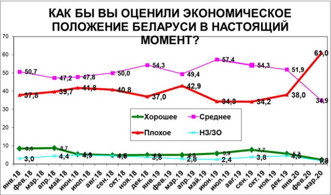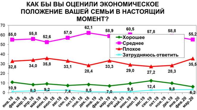 Как показало исследование, с декабря 2019 по март 2020 года количество, оценивающих экономическое положение страны, как "плохое", выросло с 38% до 61%.