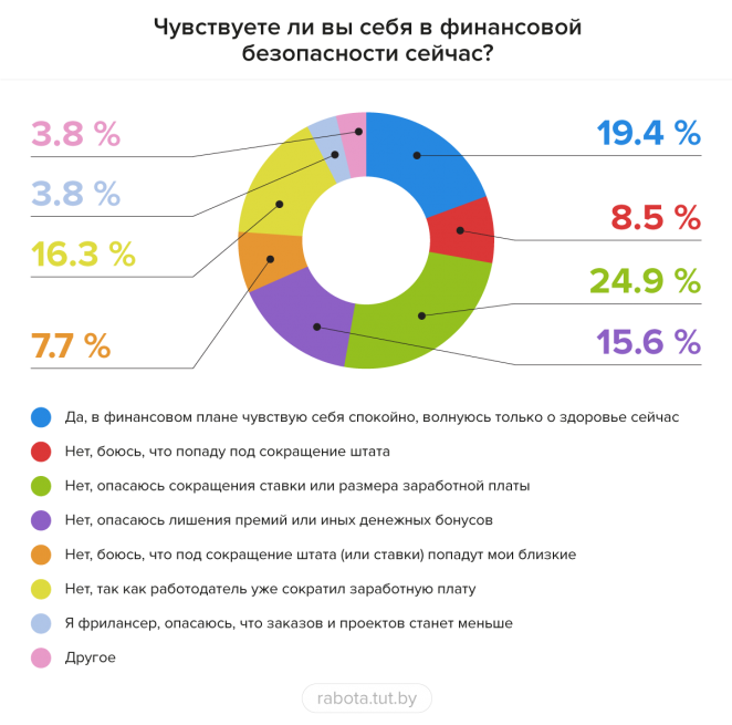 Кто из сотрудников даже при наличии работы сейчас беспокоится о своем финансовом состоянии, выяснил Исследовательский центр РАБОТА.TUT.BY. В опросе приняли участие 742 респондента, которые являются штатными или удаленными сотрудниками, а также фрилансерами. Среди опрошенных более 16% имеют подработку, а 19% заняты ее поиском сейчас. Ключевая причина – нехватка основной заработной платы.