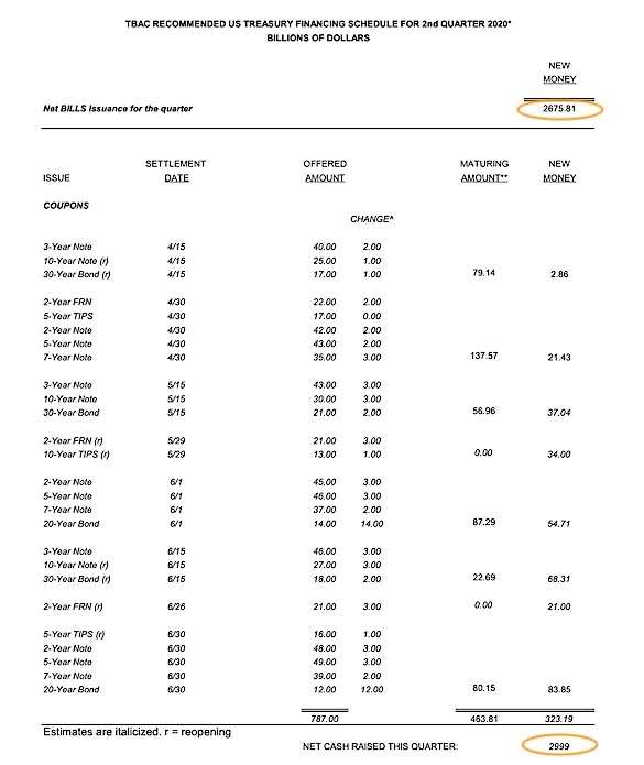 Почти 90% долга второго квартала - 2,675 трлн долларов - США разместят в виде краткосрочных векселей на срок от 4 до 52 недель. Остаток - 323,2 млрд долларов - будет продано в виде купонных облигаций на 2-30 лет.