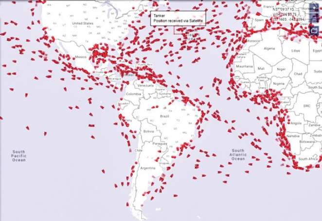 Красные точки на рисунке - загруженные нефтяные танкеры, стоящие в море из-за отсутствия спроса на нефть. Мировое потребление нефти и нефтепродуктов обычно составляет 100 млн барр./сут., производится примерно столько же. Но сейчас спрос упал на 30 млн барр./сут., что привело к переизбытку предложения. Затруднена выгрузка во многих портах. В узком Сингапурском проливе образовалась гигантская пробка из 60 танкеров, а возле Калифорнии 30 танкеров стоят на якоре.