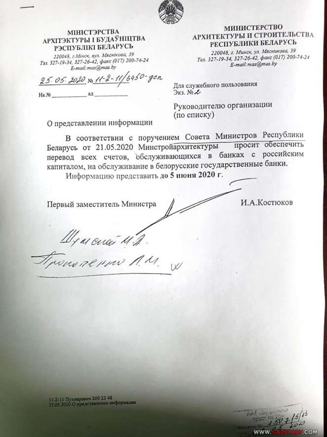 Министерство архитектуры и строительства рассылает по организациям документ с меткой «для служебного пользования».