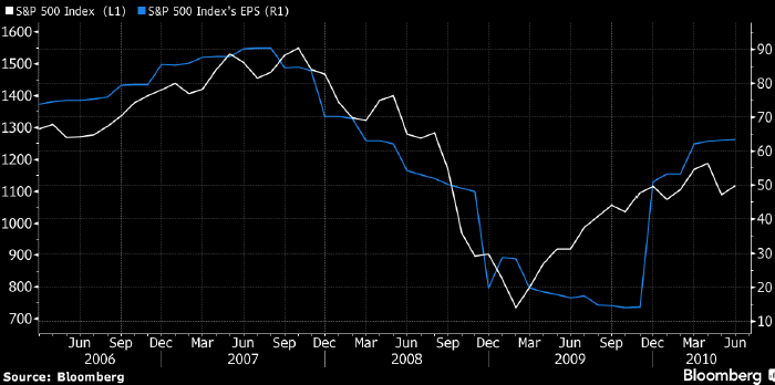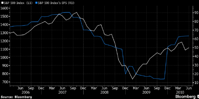 S&P 500 сформировал дно в марте 2009 года, а его показатель прибыли на акцию начал быстро расти лишь спустя три квартала: влияние стимулирующих действий ФРС на экономику проявилось с большой временной задержкой (график в начале статьи отражает динамику S&P 500 (белым) и показателя прибыли на акцию входящих в него компаний (голубым) — прим. ProFinance.ru).
