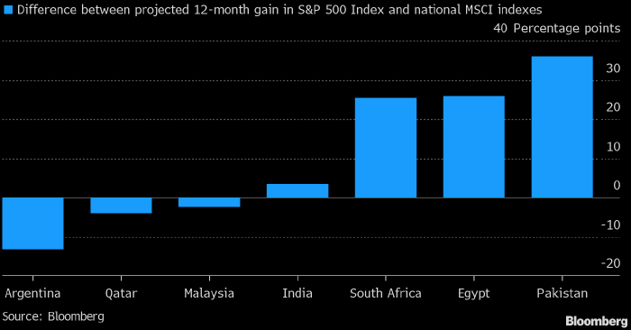 Эксперты агентства суммировали прогнозы экспертов по дальнейшей динамике S&P 500 и рынку акций отдельных развивающихся стран и выяснили, что некоторые из них обещают очень хорошую доходность. В частности, в ближайшие 12 месяцев фондовый индекс MSCI Пакистана может опередить S&P 500 на 40%, а акции компаний из Египта и ЮАР также выглядят крайне привлекательно (график ниже отражает прогнозируемую разницу в динамике между S&P 500 и фондовыми индексами некоторых стран EM в ближайшие 12 месяцев — прим. ProFinance.ru).