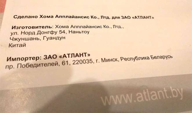 На деле же одну из серий малогабаритных морозильных камер по заказу «Атланта» выпускают в Китае. На предприятии перенос производства объясняют загруженностью собственных площадок. И все же факт остается фактом: в документах к морозильнику минское предприятие указано в качестве импортера, а зарплату за выпуск этой продукции получают китайские рабочие.
