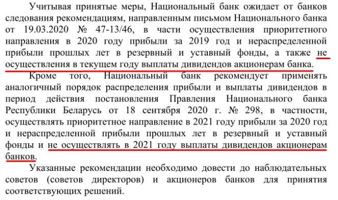 В этом письме НБ РБ настоятельно рекомендует не выплачивать дивиденды акционерам банка. Почему не надо выплачивать, спросите вы? Банк работает, получает прибыль, вот по всем правилам акционеры должны получить дивиденды.
