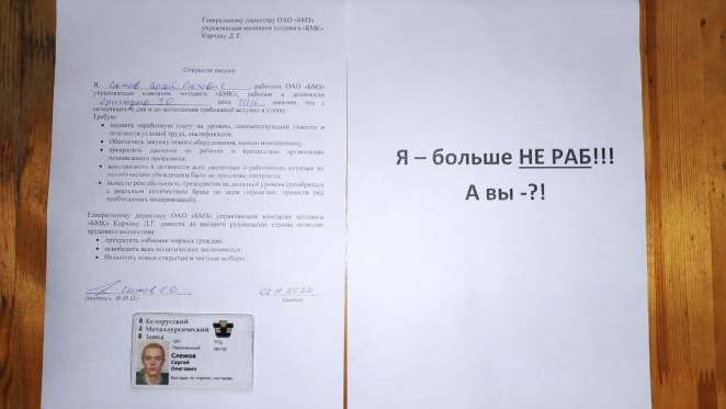 Рабочие заводов Беларуси продолжают присоединяться к забастовке. Еще на одного металлурга увеличилась стачка на БМЗ. Вступая в нее, Сергей Слежов написал: «Я больше не раб. А вы?».