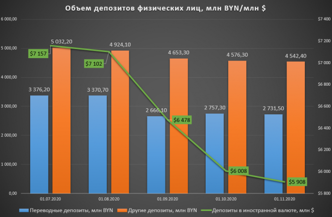 Общая сумма потерь по вкладам в белорусских рублях за август-октябрь достигла 1 млрд рублей, а по валютным вкладам населения – $1,2 млрд. Октябрь демонстрирует возвращение веры белорусов в банковскую систему, по крайне мере в отношении вкладов.