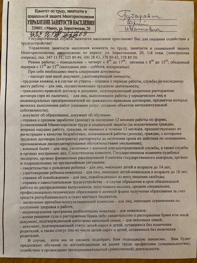 Заинтересовалась биржа и минской пенсионеркой. Женщине (она попросила не указывать ее имя) 61 год, ранее работала госслужащей, но уже несколько лет как на пенсии. В службы занятости сама она не обращалась и на учете как безработная раньше не состояла. Несколько дней назад в почтовом ящике нашла письмо за подписью председателя администрации Фрунзенского района Минска Сергея Шкруднева.