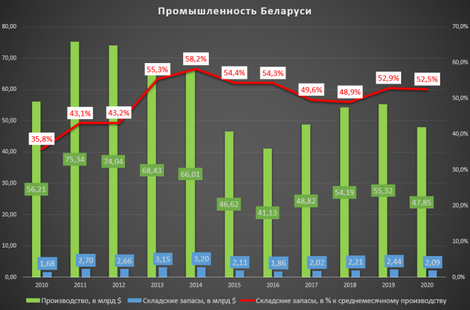 Параллельно с этим медленно растут и складские запасы, которые уже составляют более половины среднемесячного производства. Данные по складским запасам в 2020 году доступны по состоянию на 1 декабря, и есть подозрения, что по итогам года они станут рекордными для промышленности за последние 5 лет.