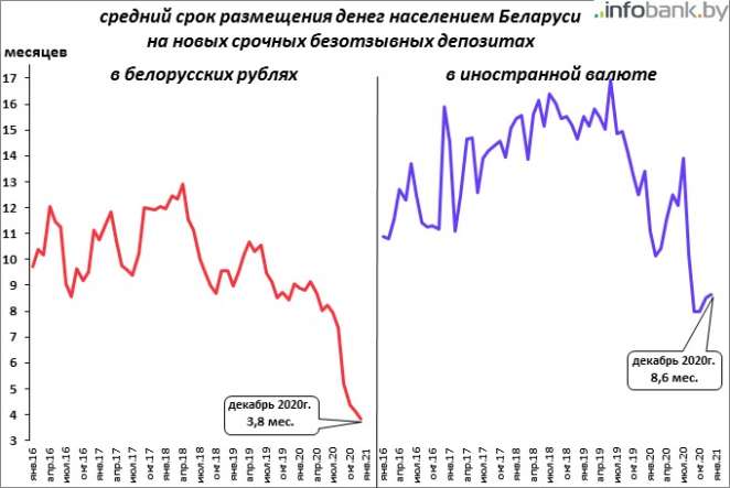 И сроки, на которые открывается безотзывной BYN-рублевый вклад, также упали за 2020 год до минимального значения.