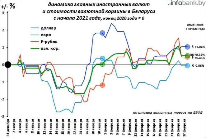 Но курс российского рубля в Беларуси было решено резко опустить, и динамика стоимости валютной корзины в пятницу 26-го февраля неожиданно развернулась в сторону удешевления.