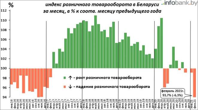 Белстат выдает соответствующую статистику – индекс розничного товарооборота в Беларуси, где сравнивается объем розничной торговли с предыдущим годом (с поправкой на инфляцию цен).