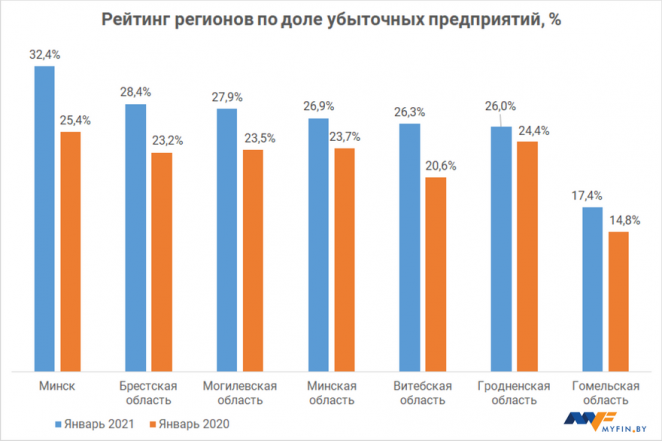 По данным за январь 2021 максимальная доля убыточных предприятий (32,4%) пришлась на Минск. В столице практически каждая третья компания оказалась в зоне отрицательной доходности. Второе место досталось Брестской области с 28,4% убыточных компаний. Тройку замыкает Могилевская область с 27,9% убыточных компаний.