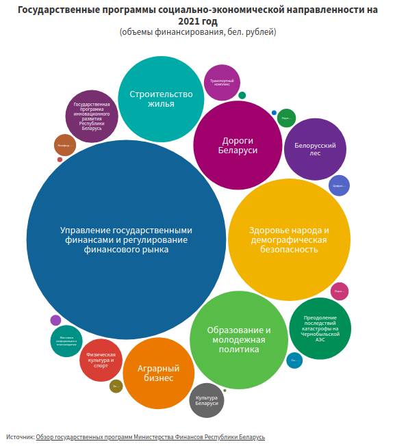 Суммарно перечисленные выше пять государственных программ социально-экономической направленности охватывают более 77% выделяемых на данное направление бюджетных средств. Оставшиеся госпрограммы распоряжаются средствами в размере от 718 млн рублей до скромных 46 тысяч. Так, средства в объеме, превышающем половину миллиарда рублей, предполагается выделить на государственные программы «Аграрный бизнес» (718,9 млн.), «Белорусский лес» (541,8 млн.), «Преодоление последствий катастрофы на Чернобыльской АЭС» (537,9 млн.). В результате их реализации должен возрасти на 4,3% экспорт продовольствия, а рентабельность продаж в сельском хозяйстве составить 6,6%. При этом должна быть сохранена лесистость страны 40,1%, а объем заготовки древесины с гектара составить 2,99 куб. (для сравнения, в 2019 году показатель составил 3,08 куб. метра).