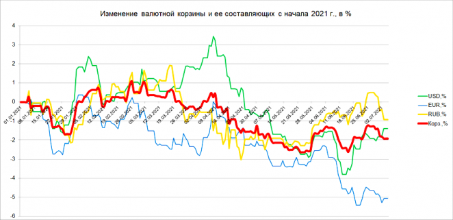 В итоге после двух недель роста стоимость валютной корзины снизилась на 0,65%.