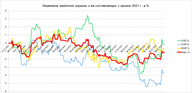 В результате снижение валютной корзины вновь сменилось ее ростом, она подорожала за неделю на 0,76%. Это максимальный недельный рост корзины с конца мая.
