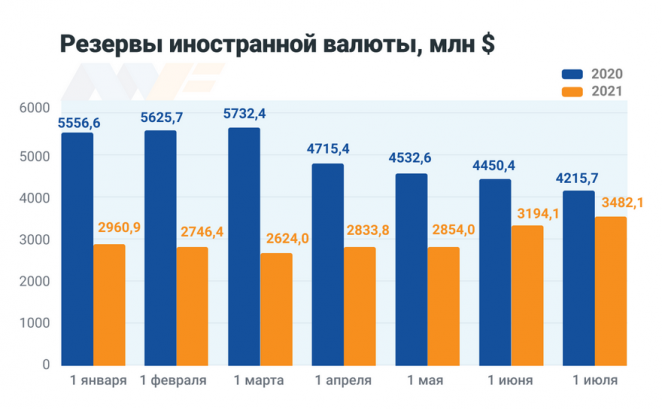 Стоит отметить, что объем валюты в резервах значительно сократился по сравнению с прошлым годом. В марте его значение достигло трехлетнего минимума, опустившись до $2,6 млрд. Всего год назад валюты было в два раза больше. После пополнения резервов за счет очередного транша ($500 млн) российского кредита на общую сумму в $1,5 млрд, валютная составляющая в июне-июле приросла сильнее всего.