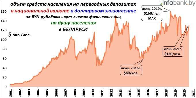Это – из-за падения во время острой фазы политического кризиса 2020 года, когда много BYN-рублей ушло с карточек на покупку долларов. Динамика в 2021-м, когда финансово-курсовая ситуация стабилизировалась – уже получше.