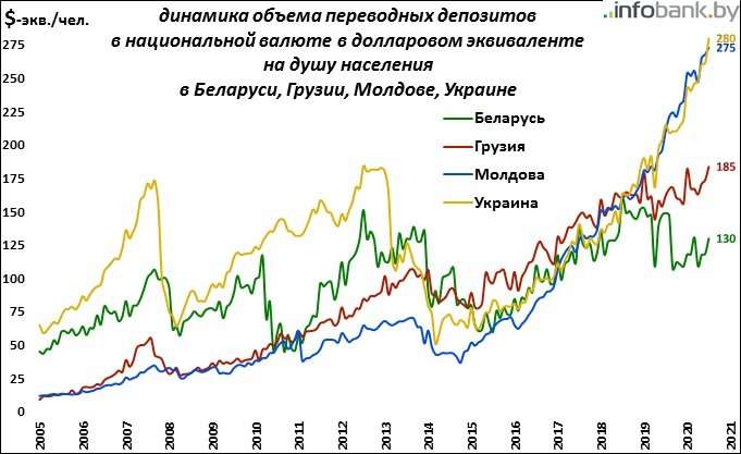 Но в Беларуси средняя зарплата выше, а теневая экономика намного ниже, чем в Молдове, Украине и Грузии. А вот подушевой объем денег на переводных депозитах в национальной валюте – меньше.