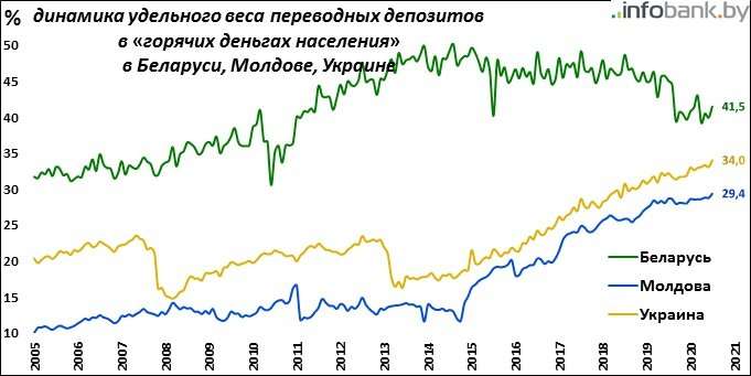 А соседи «не дремлют»: удельный вес переводных депозитов в общем объеме «горячих денег населения» (это сумма наличной денежной массы и денег на карт-счетах физлиц в национальной валюте, то есть это деньги для обеспечения текущего потребления) в Молдове и Украине уже начинает приближаться к этому показателю в Беларуси.
