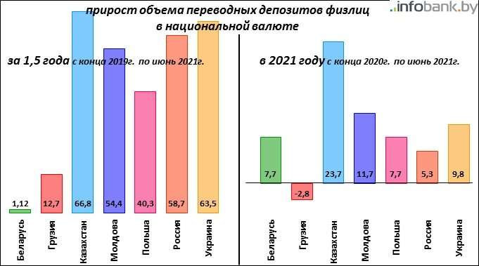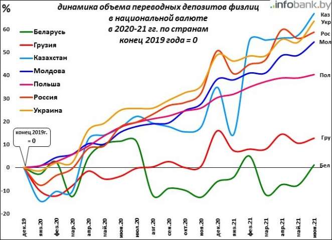 Покажем, как обстоят дела с переводными депозитами населения в соседних странах. Раньше сравнительный анализ был представлен относительно наличного денежного оборота.