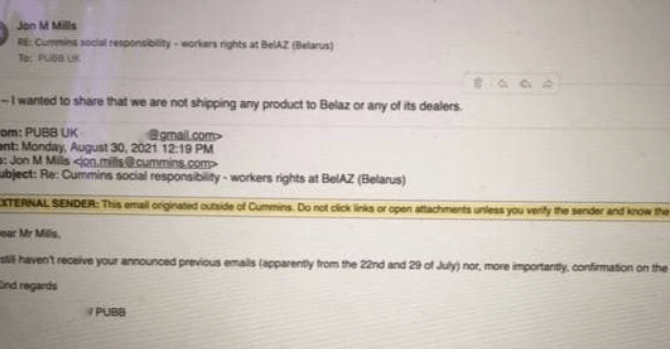 PUBB впервые обратились к Cummins почти год назад, в сентябре 2020 года, вследствие нарушений прав рабочих и репрессий на жодинском заводе. Напомним, что БелАЗ был включен в санкции ЕС.