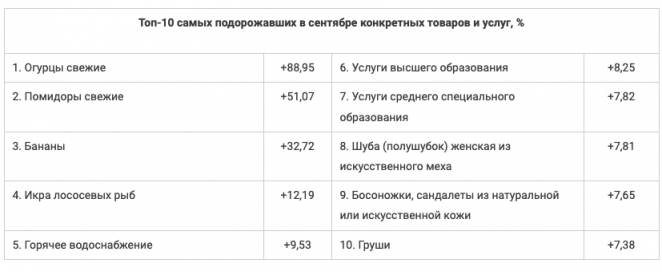 В лидерах подорожания в сентябре также оказались хозяйственное мыло (+3,43 процента), ювелирные изделия (+3,35), туристические услуги (+3,05), товары бытовой химии (+2,99), синтетические моющие средства (+2,89), телерадиотовары (+2,48) и мороженое (+2,15).