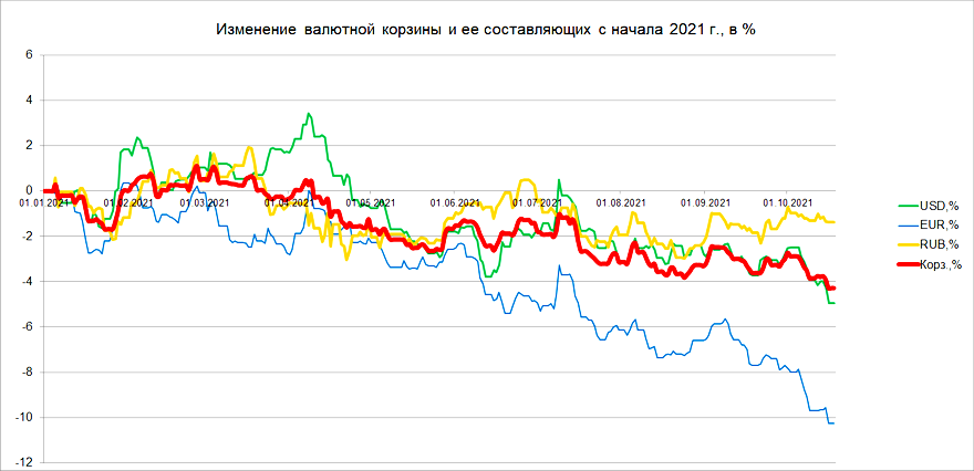 В результате валютная корзина подешевела за неделю на 0,46%. Белорусский рубль укрепляется к валютной корзине вторую неделю подряд, хотя это укрепление по сравнению с предыдущей неделей чуть замедлилось. При этом доллар, евро и валютная корзина в очередной раз обновили минимумы с начала года.