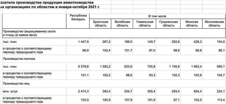 В животноводстве ситуация лучше, но статистика также фиксирует снижение показателей. Так поголовье свиней сократилось почти на 10%, крупного рогатого скота — на 1,2%. Небольшой рост есть только в производстве молока и яиц.