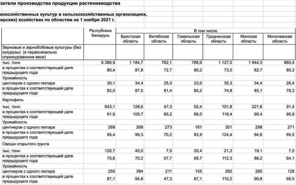Так, исходя из официальной статистики, можно увидеть провалы по многим направлениям. Например, зерновых и зернобобовых собрано только 80,4% от прошлогоднего урожая. При этом, в Витебской и Гродненской областях проседание составляет четверть от итогов 2020 года.