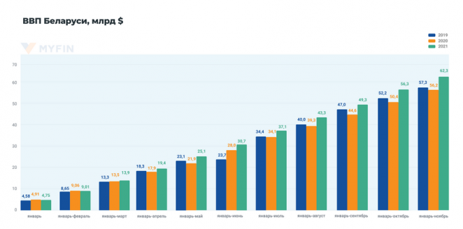 Если сравнить цифры 2020-го и 2021-го в долларах США, то увидим, что в январе-ноябре 2020-го ВВП составил $56,2 млрд, а в январе-ноябре 2021-го уже $62,3 млрд. Рост — на $6,1 млрд. В 2019-м ВВП за одиннадцать месяцев составлял $57,3 млрд.