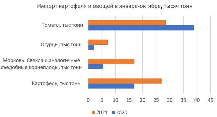 Очень большой рост импорта по группе «морковь, свекла столовая и аналогичные съедобные корнеплоды». Ввезли мы их за 10 месяцев 17 тысяч тонн — на 7 млн долларов. Это в три раза, или на 11,5 тысячи тонн больше, чем год назад. Тогда на грунтовые овощи потратили 2,6 млн долларов. Основной поставщик — Украина. Оттуда пришло 59,3% всего импорта.