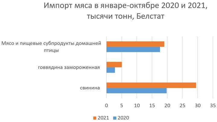 Увеличила Беларусь в этом году и импорт мяса — больше прошлогоднего куплено свинины, говядины (в замороженном виде) и птицы. Импорт охлажденной говядины уменьшился.