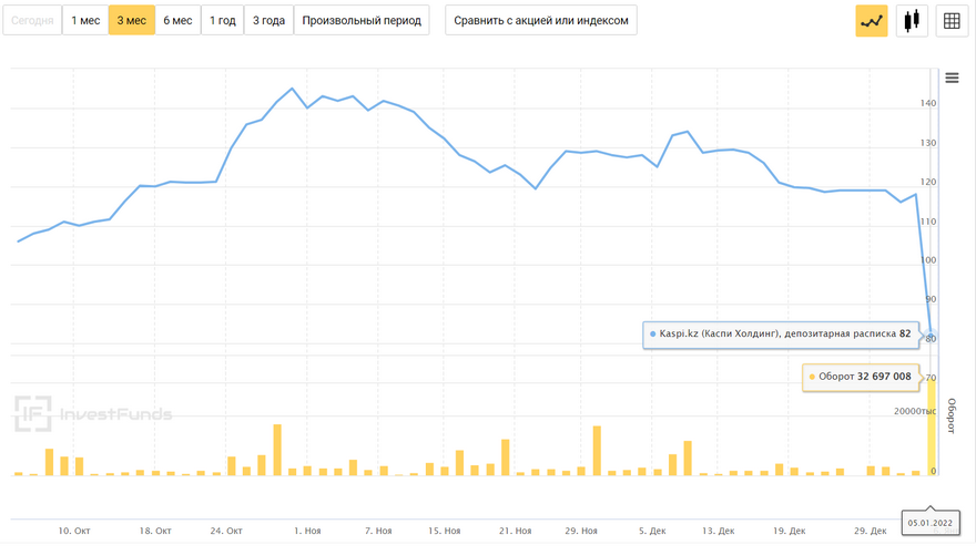 Бумаги крупнейших банков в стране Kaspi.kz и Halyk bank в четверг продолжили падать в цене на Лондонской фондовой бирже (LSE) на фоне беспорядков в стране. Всего с начала острой фазы протестов ценные бумаги банков потерял в цене от 20% до 40%. Так, к примеру депозитарные расписки банка Kaspi.kz до начала беспорядков торговались на уровне $118. Однако все пару дней спустя за них уже дают не больше $82 за единицу.