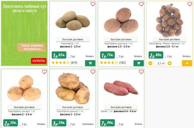 В службе доставки Fresh Комаровка отечественная фермерская картошка сейчас продается по 2,29 рубля, азербайджанская — по 9,9 рубля. Несколькими месяцами ранее импортная стоила столько же, а вот белорусскую тут продавали дешевле — по 1,9 рубля.