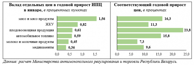 Основное влияние на увеличение потребительских цен за год, по данным министерства, оказало подорожание продовольственных товаров, преимущественно мясо-молочной и плодоовощной группы. Этот фактор, как утверждает МАРТ, обусловлен ростом затрат на производство товаров из-за увеличения мировых цен на сырье и материалы.