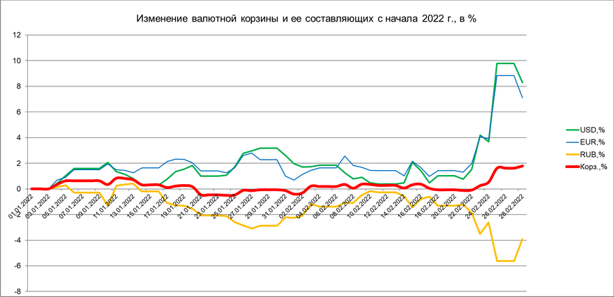В итоге валютная корзина выросла на 1,92%. Это наибольший недельный рост с декабря 2020 года.